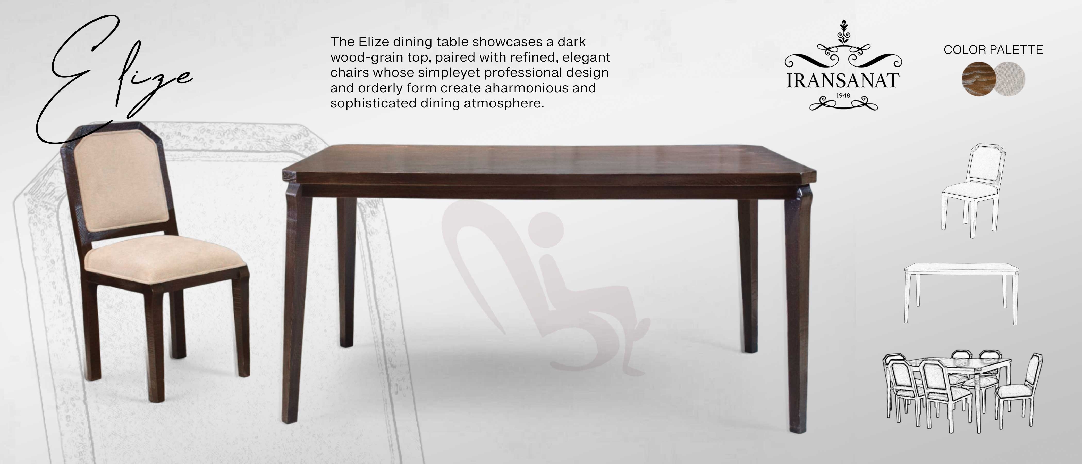 غذاخوری الیزه با طراحی نئوکلاسیک و ترکیب چشمنواز چوب راش وارداتی، بیانگر اصالت، وقار و شکوه در فضای پذیرایی شماست. رنگ پولیاستر براق و پارچهی باکیفیت ۳۵K ثمین اصفهان، در کنار امکان انتخاب رنگ چوب و پارچه، این ست را به انتخابی لوکس و هماهنگ با مبلمان الیزه تبدیل کرده است.